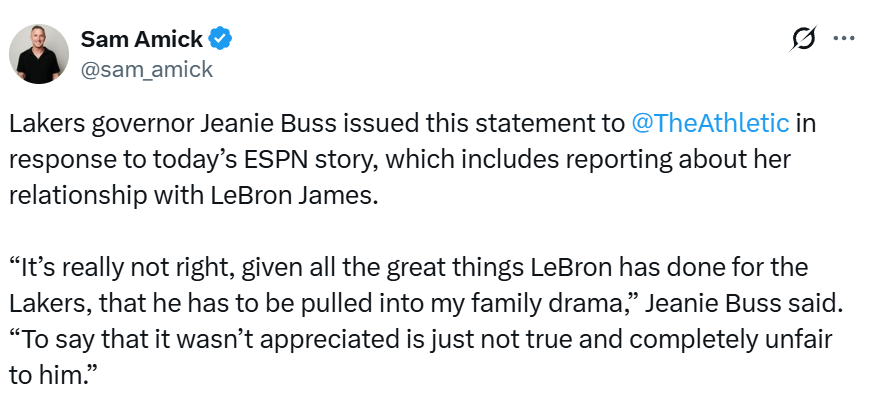 珍妮-巴斯就今日ESPN的相关报道,向The Athletic媒体发布声明,该报道中包含了关于她与詹姆斯关系的相关内容。珍妮表示:“勒布朗为湖人立下了汗马功劳,如今却被卷入我们的家族纷争,这实在太不应该了。说球队不感激他的付出,这绝非事实,对他而言也极度不公。”